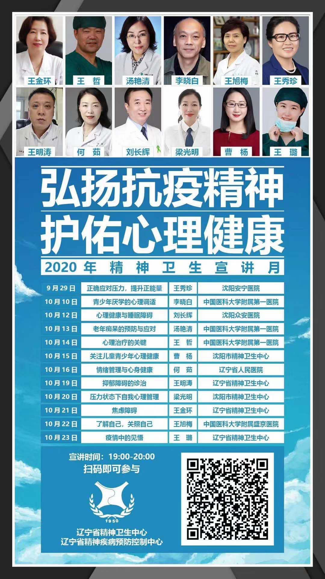为弘扬攻坚克难的伟大抗“疫”精神,积极推进健康辽宁心理健康促进行动,提升全民精神卫生和心理健康意识,普及“每个人是自己心理健康第一责任人”意识,澳门博彩在线组织12名省内知名专家开展公益科普宣讲活动,活动时间为9月29日至10月23日,采取线上培训方式,为精神卫生工作者、医护人员、基层多部门工作人员、心理健康服务志愿者等开展科普宣传和健康教育,让大家感受来自精神心理大咖们的心灵抚慰!