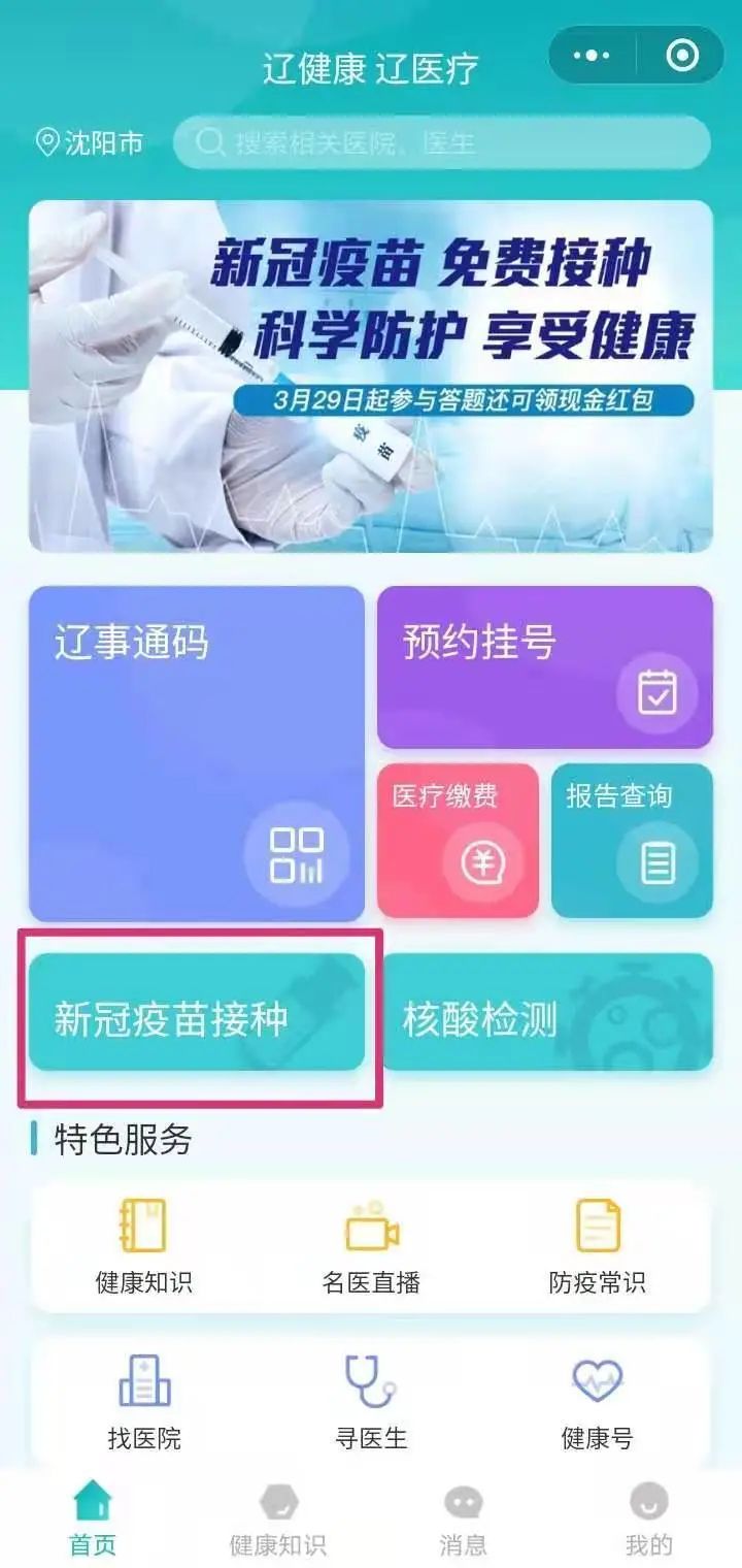 1·微信搜索“辽健康 辽医疗”小程序,进入小程序后,选择“新冠疫苗接种”模块。