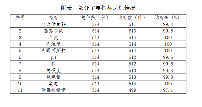 为贯彻落实《水污染防治行动计划》,按照国家卫生计生委统一部署和安排,我委根据《2016年辽宁省饮用水卫生监测项目实施方案》的要求,在全省城区范围内选定了514个市政供水的末梢水监测点进行饮用水卫生监测工作。2016年枯水期,共采集检测末梢水水样514份,通过对水质常规指标(微生物指标、毒理学指标、感官性状、一般化学指标、消毒剂指标等)和水质非常规指标(氨氮)的检测,以《生活饮用水卫生标准》进行评价,市政供水末梢水水样达标率为95.9%。主要指标检测情况见附表。