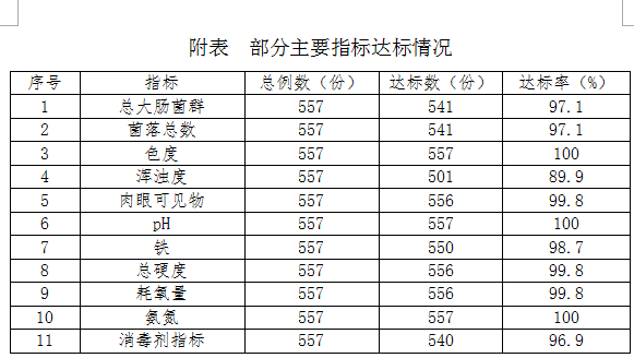 为贯彻落实《水污染防治行动计划》,按照国家卫生计生委统一部署和安排,我委根据《2016年辽宁省饮用水卫生监测项目实施方案》的要求,2016年丰水期,在全省城区范围内采集检测市政供水末梢水水样557份,通过对水质常规指标(微生物指标、毒理学指标、感官性状、一般化学指标、消毒剂指标等)和水质非常规指标(氨氮)的检测,以《生活饮用水卫生标准》进行评价,市政供水末梢水水样达标率为82.2%。主要指标检测情况见附表。